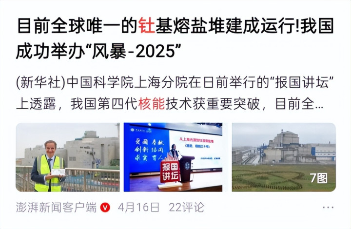 参考资料: 1、澎湃新闻客户端:目前全球唯一的钍基熔盐堆建成运行!我国成功举办“风暴﹣2025”核安保演练 2、果壳:够我国用2万年!我国攻克世界级难题,抢先美国冲刺“无限能源” 3、光明网:建成上海光源后,他“16年拓荒”新一代核能